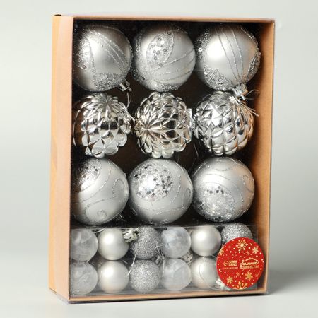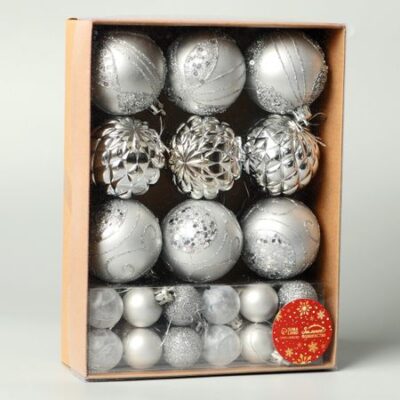 Ёлочные игрушки «Хоровод», шары новогодние, d=2.5 и 5.5 см, набор 33 шт.. Разноцветные новогодние шары «Хоровод» — это яркий, но сбалансированный акцент для праздничной елки. Набор из 33 пластиковых игрушек разного размера (2,5 и 5,5 см) украшен рисунками, вдохновленными зимними узорами. Такие детали подходят для оформления в стиле ар-деко, скандинавского минимализма или датского дизайна. Они добавляют интерьеру настроения без лишней пестроты и случайных сочетаний. <b> Что внутри</b> <ul> <li> 33 новогодних шара с рисунком.</li> <li> Диаметры — 2,5 см и 5,5 см, что позволяет создавать объемный декор.</li> <li> Цвет — серебристый, создающий ощущение зимнего света.</li> <li> Материал — прочный пластик, не боится повреждений.</li> <li> Стиль — гармонично впишутся в ар-деко, скандинавский и датский интерьер.</li> </ul> <b> Праздник в движении</b> Этот набор словно застывший «танец» зимы — четкие линии, повторяющиеся формы и мягко мерцающая поверхность. Разные размеры игрушек дают возможность играть с объемом, а единственный цветовой тон сохраняет баланс в оформлении. Подходит для тех, кто хочет создать елку, которая говорит сама за себя — без лишних слов, но с эмоциями.