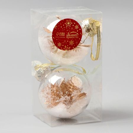 Ёлочные игрушки «Фиеста», шары новогодние, пластик, набор d=8 см, 2 шт., снежок листочки, золото. Золотистые новогодние шары с рисунком «Снежок — листочки» — это праздничный акцент для тех, кто ценит роскошь в умеренности. Два пластиковых украшения диаметром 8 см декорированы узорами, сочетающими зимнюю чистоту и теплоту золотого света. Такие игрушки подойдут для создания атмосферы ар-деко, классического или барочного стиля, не перегружая интерьер. <b> Что внутри</b> <ul> <li> 2 новогодних шара с рисунком «листочки» на прозрачной основе.</li> <li> Диаметр каждой игрушки — 8 см.</li> <li> Материал — прочный пластик, устойчивый к повреждениям.</li> <li> Стиль — сочетается с ар-деко, классикой и новогодним барокко.</li> </ul> <b> Больше света, меньше слов</b> Эти игрушки словно поймали момент перехода осени в зиму — золото листьев и прозрачность инея. Они добавляют елке текстуры и глубины, но при этом остаются строгими и продуманными. Идеально подходят как самостоятельный элемент или завершающий акцент в композиции.