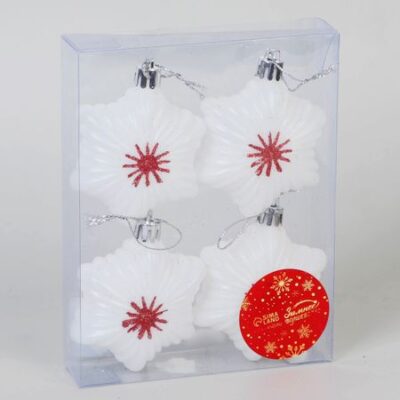 Ёлочные игрушки 4 шт. «Зимнее волшебство. Звезда праздничная» пластик, 5х7 см, белый. Ёлочные игрушки «Праздничные звезды» — это мягкий и доброжелательный акцент для новогоднего декора. Пластиковые звезды с зимним принтом подходят для украшения елки, дома или офиса — элемент праздничного убранства в стиле скандинавского минимализма и советской эстетики для тех, кто ценит свет, форму и атмосферу чуда в понятной и семейной подаче. <b> Особенности</b> <ul> <li> Тип — пластиковая игрушка на елку, используется как самостоятельный комплект или в составе общей композиции при оформлении предпраздничного пространства.</li> <li> Комплект — 4 украшения, достаточно для создания мягкого акцента на елке или в подарочной упаковке без лишней детализации.</li> <li> Материал — прочный пластик с гладкой поверхностью, который сохраняет внешний вид после нескольких сезонов использования и хранения.</li> <li> Цвет — белый оттенок с контрастным рисунком, создающий ощущение свежести, света и зимнего покоя в универсальной цветовой гамме.</li> <li> Форма — звезда, классический символ Нового года, усиливающий ощущение чуда, движения и семейного тепла в любом интерьере.</li> </ul> <b> Праздник начинается с первой звезды и ее зимнего принта</b> Этот набор делает дом частью вашей истории о подарках, снежной магии и добром ожидании торжества. Белый фон и праздничный рисунок работают вместе, чтобы передать дух Нового года и тихое семейное тепло. Используйте их как основные элементы или рядом с другими украшениями — одинаково мягко усиливая атмосферу праздника и добрую предпраздничную гармонию.
