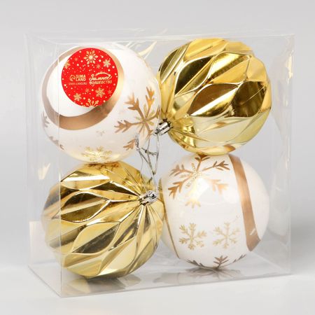 Ёлочные игрушки «Праздничные узоры», шары новогодние, d=10 см, набор 4 шт., грани, золотисто-белый. Новогодние шары с гранями — это праздничный декор для тех, кто ценит сочетание классики и современного дизайна. Набор из 4 пластиковых игрушек диаметром 10 см оформлен в золотисто-белой гамме с рисунком, выполненным в стиле ар-деко и классической новогодней эстетике. Такие игрушки станут заметным акцентом на елке и подчеркнут торжественность момента. <b> Особенности</b> <ul> <li> Форма — шар с гранями, необычное решение для елочных украшений.</li> <li> Диаметр — 10 см, крупные размеры для центрального размещения на дереве.</li> <li> Цветовая гамма — бело-золотистая, создающая ощущение зимнего блеска и уюта.</li> <li> Стиль — классика и ар-деко, подчеркнутые формой, цветом и детализацией.</li> <li> Комплектация — 4 штуки, идеально для создания яркого акцента на елке.</li> <li> Материал — прочный пластик, подходящий для многократного использования.</li> </ul> <b> Ёлка как отражение праздника</b> Эти шары создают образ зимнего торжества, где каждый элемент работает на общий стиль. Золотисто-белые оттенки, фактурная поверхность и крупные формы делают их центральным элементом декора. Используйте игрушки как основу или дополнение к уже имеющимся украшениям — они одинаково гармонично вписываются в любую праздничную композицию.