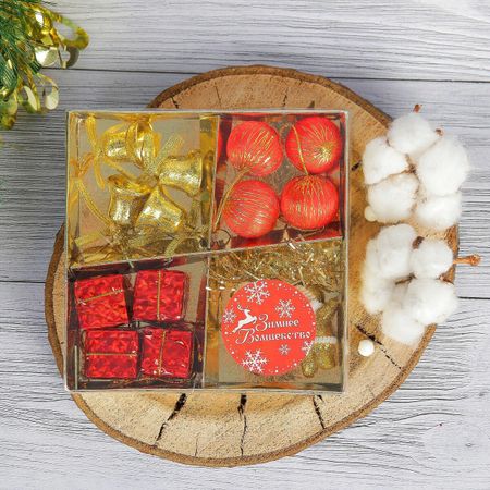 Ёлочные игрушки «Сюрприз», шары новогодние, набор 14 шт. (4 колокольчика, 8 шаров, 2 ангела), золотистый/красный. Новогодние игрушки «Сюрприз» — это разнообразный и стильный набор для украшения елки в золотисто-красной гамме. В комплекте 14 пластиковых элементов: 8 шаров, 4 колокольчика и 2 ангела диаметром 3 см с однотонной поверхностью или декоративным рисунком. Украшения выполнены в стиле новогоднего барокко и скандинавского дизайна, что делает их универсальным решением для праздничного оформления. <b> Особенности</b> <ul> <li> Формы — шары, колокольчики и ангелы, добавляющие елке разнообразия и символики праздника.</li> <li> Цветовая гамма — сочетание золотистого и красного, напоминающее традиционное оформление Нового года.</li> <li> Диаметр шара — 3 см, компактные размеры для плотного или акцентного украшения дерева.</li> <li> Поверхность — часть игрушек однотонная, другие — с рисунком, подчеркивающим детализацию и стиль.</li> <li> Стиль — новогоднее барокко и скандинавский уют, где важны форма, цвет и настроение.</li> <li> Комплектация — 14 шт., включая разные типы игрушек для создания целостной или фоновой композиции.</li> <li> Материал — прочный пластик, подходящий для многократного использования.</li> </ul> <b> Праздник начинается с яркого акцента</b> Этот набор превращает елку в пространство зимней гармонии, где каждый элемент работает на общий эффект. Золотые и красные оттенки, разные формы и точность деталей создают ощущение настоящего торжества. Используйте игрушки как основу или как дополнение к уже имеющемуся декору — они одинаково хорошо добавляют дереву свет, движение и атмосферу предпраздничного настроения.