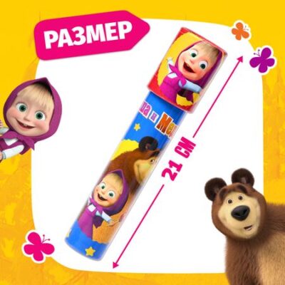 Калейдоскоп, Маша и медведь. <em> Создавай волшебные узоры с любимыми героями!</em> Калейдоскоп «Маша и Медведь» — это яркая игрушка для детей от 3 лет. Вращайте трубку — и перед глазами будут появляться красочные узоры. Простое управление и яркие образы увлекут ребенка надолго. <b> Особенности</b> <ul> <li> Внутри калейдоскопа — разноцветные элементы, которые складываются в неповторимые узоры.</li> <li> Компактный размер — 21 см, удобно держать в маленьких руках, брать с собой на прогулку или в поездку. Легкий и прочный корпус выдержит активные игры.</li> <li> Не требует батареек, нет мелких деталей. Достаточно поворачивать трубку, чтобы узоры менялись.</li> </ul> <b> Развиваемся с Машей и Медведем</b> Калейдоскоп развивает фантазию, цветовосприятие и концентрацию. Ребенок тренирует внимание и придумывает сюжеты. Отличный подарок для мальчиков и девочек, которые любят мультфильм. Подарите ребенку радость открытий — пусть каждый поворот создает сказку!