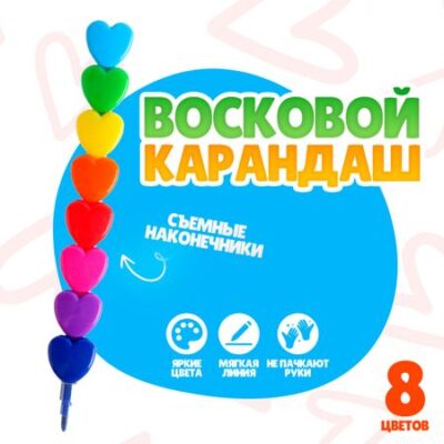 Карандаш восковой «Сердечко», набор 8 цветов. Набор восковых мелков «Сердечко» — это творческое решение для рисования и развлечения. В комплекте вы найдете 8 разноцветных фигурных мелков, которые подойдут для детского творчества дома, в школе или на отдыхе. <b> Преимущества</b> <ul> <li> Удобная фигурная форма делает мелки интересными и приятными для детских рук.</li> <li> Яркие цвета вдохновляют на создание уникальных рисунков и поделок.</li> <li> Мелки изготовлены из качественной пастели на основе воска, что обеспечивает плавное нанесение цвета на бумагу.</li> <li> Компактная упаковка — удобно брать с собой.</li> </ul> Идеально подходят для рисования, раскрашивания и создания декоративных элементов. Набор станет отличным вариантом для детского творчества, развития мелкой моторики и фантазии. <b> Преимущества</b> <ul> <li> Простота в использовании для детей всех возрастов.</li> <li> Эстетичный дизайн и привлекательные формы мелков.</li> <li> Отсутствие штрихкода делает их отличным выбором для индивидуального использования.</li> </ul> Создайте атмосферу творчества и радости с набором восковых мелков «Сердечко»!