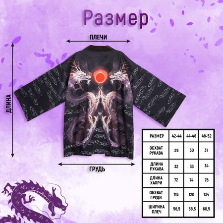 Карнавальное хаори «Магические драконы», р. 42–44 (S). Это яркое хаори с магическими драконами станет выразительным дополнением к вашему образу. Легкая и удобная накидка выполнена из полиэстера, что делает ее комфортной для ежедневного ношения и простого ухода. <b> Особенности</b> <ul> <li> Принт с изображением драконов, привлекающий внимание.</li> <li> Яркие и насыщенные цвета, которые долго сохраняют свой первоначальный вид</li> <li> Легкая и прочная ткань устойчивая к сминанию, быстросохнущая структура</li> </ul> Хаори идеально подходит для создания образов на тематические мероприятия, такие как косплей-вечеринки, фестивали или фотосессии. В то же время, его можно использовать и в повседневной жизни как легкий и стильный элемент гардероба. Эта накидка будет гармонично смотреться в сочетании с другими элементами одежды, создавая законченный и уникальный образ, который подчеркнет индивидуальность владельца.