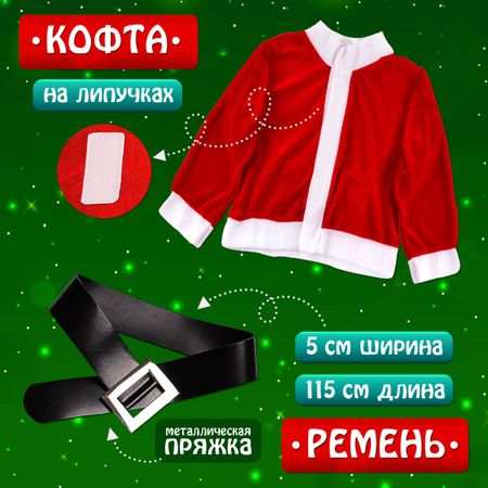 Карнавальный костюм новогодний «Добрый Санта», рост 104-110 см, кофта, штаны, колпак, ремень, брошки. Карнавальный набор «Добрый Санта» — это все, что нужно для создания яркого и запоминающегося образа самого доброго зимнего волшебника. <b> Что входит в набор:</b> <ul> <li> Яркая кофта с традиционными новогодними мотивами.</li> <li> Удобные штаны, которые не сковывают движения.</li> <li> Колпачок с помпоном, который дополнит образ.</li> <li> Три тематических значка для создания индивидуального стиля.</li> <li> Пояс, который подчеркнет талию и завершит образ.</li> </ul> Изготовлен костюм из качественных материалов, приятных на ощупь. Он не только выглядит празднично, но и комфортен в носке. Идеально подходит для новогодних утренников, детских праздников и тематических вечеринок. Ваш ребенок с удовольствием перевоплотится в доброго Санту и окунется в атмосферу волшебства.