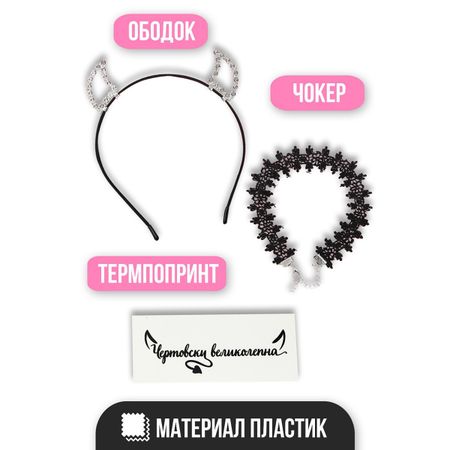 Карнавальный набор «Чертовски великолепна», ободок, чокер, термопринты. Карнавалы и костюмированные вечеринки — это всегда интересные перевоплощения, которые делают веселые встречи незабываемыми. Вам не потребуется искать и покупать целый наряд, ведь в наборе есть все необходимые детали для создания узнаваемого и игривого образа. Удивите необычной ролью друзей и гостей торжества, а также свою вторую половинку!