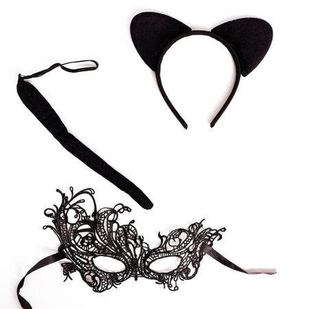 Карнавальный набор взрослый «Женщина — кошка»: ободок, хвостик, маска. Карнавалы и костюмированные вечеринки — это всегда интересные перевоплощения, которые делают веселые встречи незабываемыми. Вам не потребуется искать и покупать целый наряд, ведь в наборе есть все необходимые детали для создания узнаваемого и игривого образа кошечки. Удивите необычной ролью друзей и гостей торжества, а также свою вторую половинку! <b> В комплект входят:</b> <ul> <li> ушки на ободке;</li> <li> хвостик;</li> <li> кружевная маска. </li> </ul>