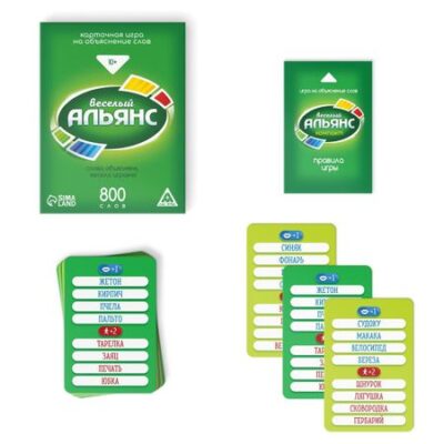 Карточная игра на объяснение слов «Веселый Альянс», 50 карт. <b> Игра на объяснение слов для всей семьи</b> В этой игре вам предстоит объяснять слова устно и с помощью пантомимы! Изображайте различные понятия, а другие участники пусть попробуют догадаться. Здесь вы найдете целых 800 слов для объяснения. Устройте настоящее соревнование с игрой «Веселый альянс»! <b> Что нужно делать?</b> Участники должны за 30 секунд объяснить как можно больше слов с карточек. А на этих карточках находятся восемь слов, четыре из которых нужно объяснить устно, а другие четыре — с помощью пантомимы. <b> Что значит устно?</b> Это значит, что нужно объяснять вслух, не используя однокоренных слов. Опишите, что вы видите: это животное? А может, это фрукт или предмет? Какой он формы и цвета? Если участник выбирает устный способ объяснения, то за каждое отгаданное слово он получает 1 очко. <b> Что значит пантомимой?</b> Проявите свои артистические способности — объясняйте с помощью мимики и жестов! Это значит, что нельзя произносить слова и звуки, а также чертить в воздухе очертания букв, цифр и указывать на предметы, о которых идет речь в карточке. Если игрок объясняет пантомимой, то за каждое отгаданное слово он получает по 2 очка. Тот, у кого будет больше всех очков, когда закончатся карточки, становится победителем! <b> Внутри вы найдете:</b> <ul> <li> 50 карточек,</li> <li> правила игры.</li> </ul> <b> Играйте и объясняйте слова на время!</b>