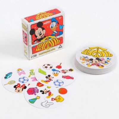 Карточная игра на скорость и реакцию «Дуббль», 55 карт, 5+, Микки Маус и его друзья. Веселая игра на внимание и реакцию! Внутри вас ждет 55 карт с уникальным набором картинок. На каждой паре карт есть одно общее изображение. Его-то вам и нужно найти! Скорее собирайтесь всей семьей и начинайте веселье! Как играть? На счет «три» все участники переворачивают свои карточки и смотрят, какое изображение на их карточках совпадает с верхней картой из колоды (каждый ищет совпадение карты в центре стола со своей картой). Первый, кто отыщет такую картинку, кричит ее название, забирает верхнюю карту из колоды и кладет ее сверху на свою карту. Тем самым он открывает следующую карточку из основной колоды. Теперь совпадения нужно искать уже с другими картинками. А как только все карты в колоде закончатся, переходите к подведению итогов. Игрок, который набрал больше всех карт, объявляется победителем! Внутри вы найдете 55 карт. Правила игры. Играйте, хватайте и побеждайте! Дополнительно Размер карт: 83 × 83 мм