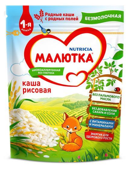 Каши Малютка родные каши с родных полей! В основе наших рецептов отборные злаки, выращенные и отобранные по высоким стандартам качества. Создавая наши каши, специалисты компании Nutricia вдохновлялись природой регионов России. Каждая порция содержит необходимые для развития белки, витамины и минералы, а также углеводы, которые дают малышу энергию для роста. Каши Малютка вся сила России для вкусного и высококачественного прикорма вашего малыша. 1 ложка. Заботливое начало. — Энергия для роста; — Без консервантов; — Без добавления сахара и соли; — С витаминами и минералами; — Низкоаллергенная; — Без Глютена. Каша безмолочная сухая быстрорастворимая рисовая низкоаллергенная Малютка, для питания детей с 4 месяцев, согласно требованиям норм законодательства России и Республики Казахстан. Для оптимального роста, развития и здоровья малыша Всемирная Организация Здравоохранения рекомендует исключительно грудное вскармливание в первые 6 месяцев жизни и последующее введение прикорма при продолжении грудного вскармливания. Nutricia полностью поддерживает данные рекомендации. Проконсультируйтесь со специалистом перед началом использования продукта. Для детского питания. Рекомендуется готовить кашу непосредственно перед употреблением. Никогда не используйте остатки готового питания для последующего кормления. При введении прикорма рекомендуется приучать ребенка есть его с ложечки. После каждого приготовления питания тщательно закрывайте упаковку. Не допускается назначать детям, имеющим аллергию на любой компонент, входящий в состав продукта.