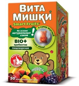 ВитаМишки® Bio+ пребиотик — сбалансированный витаминно-растительный комплекс с пребиотиками в виде вкусных мармеладных пастилок-мишек с натуральными фруктовыми и овощными экстрактами для детей с 3-х лет.• Входящие в состав комплекса инулин, фруктоолигосахариды и экстракт плодов фенхеля способствуют восстановлению полезной микрофлоры кишечника, улучшают пищеварение и нормализуют аппетит.• Способствует регулярному освобождению кишечника.• Обогащает детский организм витаминами группы В.