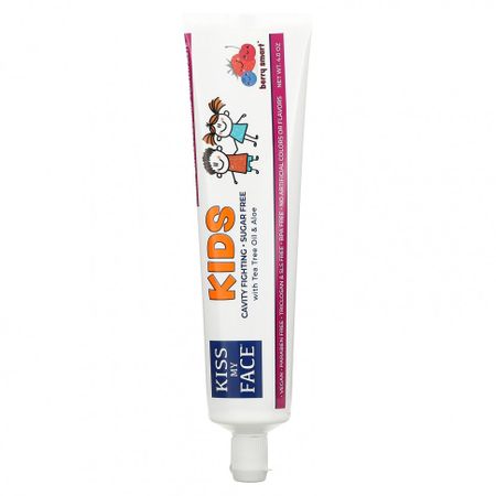 Борьба с кариесом Без сахараС маслом чайного дерева и алоэ вера Веганский продуктБез парабеновНе содержит триклозан и лаурилсульфат натрияНе содержит бисфенола AБез искусственных красителей и ароматизаторовЭтичный продукт Не содержит ингредиентов животного происхожденияСертификация Leaping Bunny Наш рецепт:Без искусственных красителейБез искусственных ароматизаторовБез лаурилсульфата натрия/триклозанаБез искусственных подсластителей Назначение. Способствует профилактике кариеса. В зубной пасте Kiss My Face используются самые лучшие ингредиенты для чистых, здоровых зубов и отличного вкуса, которые понравятся вашим детям и которые захотят чистить зубы не менее двух раз в день! Эта формула от кариеса с фторидом также содержит такие ингредиенты, как масло чайного дерева, алоэ, ксилитол и натуральный ягодный ароматизатор.Kiss My Face…because we care™.Полезные продукты для личной гигиены с 1983 года.
