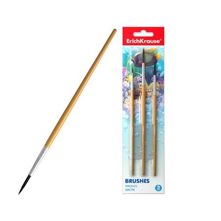 Кисти ErichKrause® для рисования акварельными красками и гуашью. Хорошо впитывают и отдают краску, рабочая часть кисти покрыта гуммирующим составом, защищающим ее при хранении и транспортировке. Ручка изготовлена из натурального дерева и покрыта защитным лаком. Кисти разного размера позволяют рисовать как крупными, широкими мазками, так и прорабатывать мелкие детали рисунка. Цельнометаллическая бесшовная обойма из алюминия устойчива к коррозии. Круглые 2, 4, 5