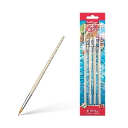 Кисти ArtBerry® для рисования акварельными красками и гуашью. Рабочая часть кисти покрыта гуммирующим составом, защищающим ее при хранении и транспортировке. Ручка изготовлена из натурального дерева и покрыта защитным лаком. Цельнометаллическая бесшовная обойма из алюминия устойчива к коррозии. Круглые 2, 3, 5, плоская — 8.