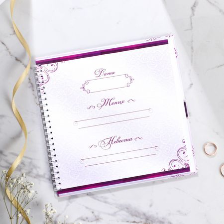 Книга пожеланий на пружине «Пурпурная свадьба». Гостевая книга — прекрасный атрибут свадебного вечера. Записывать пожелания в эту книгу понравится всем гостям. А вам понравится то, что через много много лет вы сможете окунуться еще раз в атмосферу вашего праздника. Идеально для свадьбы в стиле бохо, рустик, минимализм, прованс. Книга сделана из преплетного картона 1,25 мм с глянцевой ламинацией. В книге 40 односторонних листа размером 21х21 см плотностью 80 гр., первый лист для молодоженов с указанием даты торжества и имен, последующие 39 листов для искренних пожеланий счастливой семейной жизни жениху и невесте.