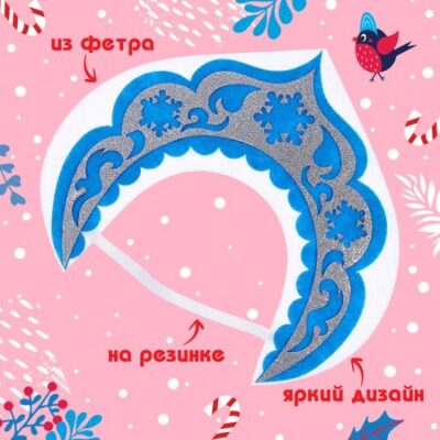 Кокошник карнавальный «Снегурочка», из фетра. Карнавальный кокошник — аксессуар, который поможет создать старинный образ русской красавицы! Взрослым он пригодится для карнавального мероприятия, а дети смогут надеть его на утренник или любое другое событие. Также кокошник — это необычный и интересный аксессуар для фотосессии! <b> Особенности</b> <ul> <li> Кокошник представлен в едином размере, который подходит для детей и взрослых.</li> <li> Аксессуар удобно крепится на голову при помощи резинки, которая не давит на голову.</li> <li> Карнавальный кокошник сохранит вашу прическу.</li> <li> Кокошник сделан из фетра.</li> </ul>