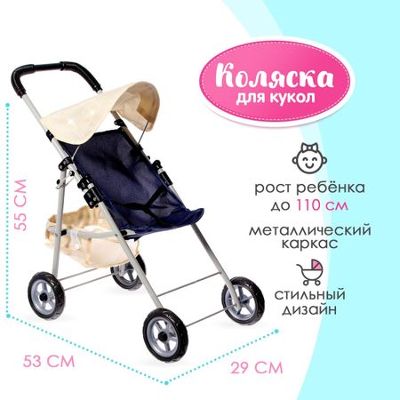 Коляска для кукол, металлический каркас, летняя. Коляску для куклы можно назвать одной из самых любимых игрушек для девочек. Маленькие леди с раннего детства проявляют интерес к сюжетно-ролевым играм, в процессе которых они интуитивно повторяют действия своих родителей. <b> Особенности коляски</b> <ul> <li> Каркас выполнен из металла, материал колес — EVA.</li> <li> Подходит для кукол до 42 см.</li> <li> Размер коляски: 53 × 29 × 55 см. Подходит для детей ростом до 110 см.</li> <li> Ручка не регулируется.</li> <li> Коляска компактно складывается. Корзина в комплекте будет служить местом хранения для всех необходимых вещей ребенка и его пупса.</li> <li> Функции качания нет.</li> </ul> <b> Играть в куклы — полезно</b> Для девочек это не только развлечение, но и развитие материнских навыков, ведь так интересно заботиться о маленьком человечке, кормить его с ложечки, пеленать и просто гулять. Именно по этим причинам коляска для куклы не просто полезна, но и необходима, чтобы разнообразить досуг ребенка.