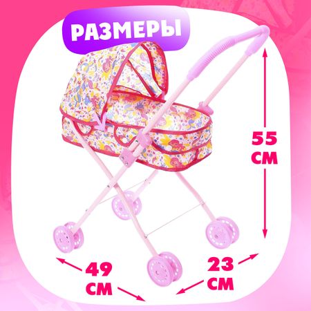 Коляска для кукол «Русалка» универсальная, металлический каркас. Маленькие леди с самого раннего детства проявляют интерес к сюжетно-ролевым играм, в процессе которых они интуитивно повторяют действия своих родителей. Во время игры происходит развитие материнских навыков: девочка заботится о кукле, кормит ее с ложечки, пеленает и гуляет с ней. Именно по этим причинам коляска для куклы не просто полезна, но и необходима для того, чтобы разнообразить досуг ребенка. Изделие подходит для теплой погоды. Благодаря крепким пластиковым колесам и металлическому каркасу коляска очень устойчива при езде. Вы можете положить куколку в люльку и поднять козырек. Высота от пола до ручки (не регулируется) — 55 см; размер люльки — 33 × 17 × 8 см; размер коляски — 49 × 23,5 × 55 см. <b> Играйте и развивайтесь вместе с нами!</b>