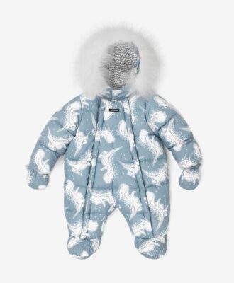 Динозавры на этом голубом комбинезоне с варежками станут верными компаньонами малыша во время прогулки! Комбинезон на искусственном пуху выполнен из блестящей влагостойкой плащовки с крупным принтом, на подкладке из меланжевого трикотажа. Удобное конструктивное решение с двумя молниями на передней части делает сборы на прогулку быстрыми и приятными. Натуральный отстёгивающийся мех енота на опушке капюшона придает изделию завершённость и защищает лицо малыша от ветра и холода.