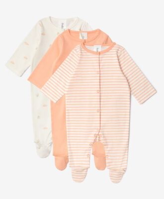 Свобода с первых дней жизни! Комплект из 3-х комбинезонов-слипов с закрытыми ножками — достойная замена распашонкам и пелёнкам, позволяющая малышке быть активной и с интересом познавать окружающий мир. Комбинезоны выполнены из мягкого хлопкового трикотажа с рисунком, который гарантирует максимальный комфорт, уют и безопасную эксплуатацию. Изделия застёгиваются на кнопки. В оформлении моделей использована фирменная жаккардовая нашивка.