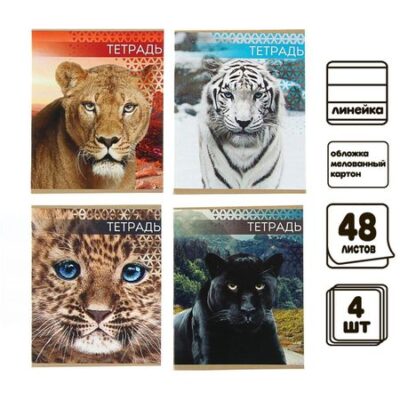 Комплект тетрадей из 4 штук, 48 листов в линию "Дикие кошки", обложка мелованный картон, блок №2, белизна 75% (серые листы). Комплект тетрадей Calligrata отлично подойдет для любого возраста, пола и рода деятельности. <b> Особенности:</b> <ul> <li> Оригинальный и стильный дизайн.</li> <li> Классическая разметка с полями.</li> <li> Удобное письмо по бумаге.</li> <li> Прочность и надежность.</li> </ul> <b> Характеристики:</b> <ul> <li> Количество листов — 48.</li> <li> Линовка — в линейку.</li> <li> Обложка — мелованная бумага.</li> <li> Блок №2, белизна 75%.</li> <li> Цвет — ассорти.</li> </ul> Комплект тетрадей из 5 штук, 4 уникальных и одна повторяющаяся.
