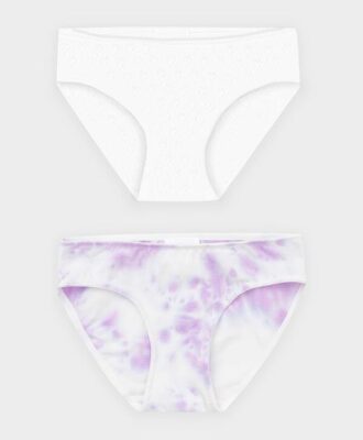 Комплект трусов-слипов из двух штук для девочки. Мягкая ткань из хлопка с небольшим добавлением эластана подарит комфортные ощущения при соприкосновении с кожей, обладает оптимальной растяжимостью, позволяет телу дышать и выдерживает большое количество стирок. Широкая ластовица в трусах выполнена из основной ткани. В белой модели мелкая перфорация в виде сердечек, в цветной модели использована оригинальная техника окрашивания tie dye. Верх и проймы дополнены эластичными резинками. Анатомический крой детских трусов обеспечивает оптимальную посадку по фигуре, чтобы ребенок находился в комфорте, занимаясь повседневными делами.