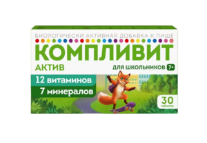 Действие БАД «Компливит® Актив» обусловлено свойствами входящих в состав компонентов. Комплекс витаминов и минералов, являющихся важными факторами полноценного физического и интеллектуального развития ребенка, укрепления иммунитета, усиления адаптационных возможностей организма. Сбалансирован с учетом рекомендуемых уровней потребления микронутриентов.Витамин А необходим для иммунной защиты организма ребенка, повышает барьерную функцию слизистых оболочек, повышает сопротивляемость организма к вирусным и бактериальным инфекциям. Принимает участие в повышении сопротивляемости организма к инфекциям. Участвует в синтезе зрительных пигментов, необходим для сумеречного и цветового зрения. Необходим для формирования и роста костей, для здорового состояния кожи, зубов, волос. Является антиоксидантом.Витамин Е обладает выраженными антиоксидантными свойствами, способствует укреплению иммунитета и повышению защитных сил организма. Оказывает положительное влияние на функции нервной и мышечной ткани, участвует в процессах кроветворения. При недостатке в организме витамина Е повышаются подверженность инфекционным заболеваниям, риск воспалительных процессов, появляется мышечная слабость.Витамин С играет важную роль в работе иммунной системы, способствуя повышению устойчивости организма к инфекциям; обеспечивает синтез коллагена; участвует в формировании и поддержании структуры и функции хрящей, костей, зубов; участвует в созревании эритроцитов, в регенерации тканей. Витамин С способствует поддержанию в здоровом состоянии кожи, снижает воспалительные реакции. Обладает выраженными антиоксидантными свойствами, нормализует проницаемость капилляров.Витамин В1 способствует нормализации работы нервной и сердечно-сосудистой систем, способствует повышению иммунной защиты организма, предупреждает развитие физической и психической утомляемости.Витамин В2 участвует в белковом, углеводном и жировом обменах, синтезе гемоглобина, поддерживает зрительную функцию. При недостатке витамина В2 характерны появление трещин на губах и в углах рта, конъюнктивит.Витамин В6 необходим для нормального функционирования центральной и периферической нервной системы, улучшает переносимость психоэмоциональных нагрузок, уменьшает раздражительность, повышает умственную работоспособность; облегчает адаптацию организма в условиях стресса.Витамин В3 (никотинамид) участвует в процессах тканевого дыхания, жирового и углеводного обмена. Недостаточность витамина В3 в организме характеризуется нарушениями стула, дерматитами и психическими расстройствами.Витамин В5 участвует в углеводном и жировом обмене, имеет важное значение для процессов роста, способствует построению, регенерации кожных покровов и слизистых, участвует в передаче нервных импульсов. Проявляться недостаточность витамина В5 может дерматитами, желудочно-кишечными расстройствами, мышечной слабостью, нарушениями работы сердечно-сосудистой системы.Витамин В12 является важным фактором нормального роста, кроветворения и развития эпителиальных клеток, повышает способность тканей к регенерации; необходим для функционирования центральной нервной системы ребенка; снижает риск развития анемии и хронической усталости.Фолиевая кислота (В9) принимает участие в синтез