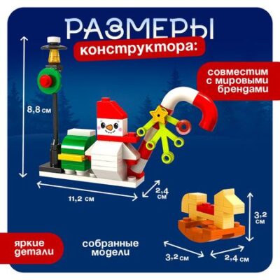 Конструктор «Новогодние истории», снеговик, 74 детали. <b> Новогодние истории</b> Маленькому любителю волшебства непременно понравится новогодний конструктор. С ним ребенок не только воспроизведет праздничный сюжет, но и сможет придумать свои истории. <b> Функциональные особенности</b> Игровой набор содержит 74 детали и инструкцию по сборке. Элементы изготовлены из высококачественной пластмассы, надежно соединяются между собой и разбираются без особого труда. <b> Неоспоримая польза</b> Игры с конструктором разовьют у ребенка мелкую моторику, внимательность, воображение, логическое и образное мышление.