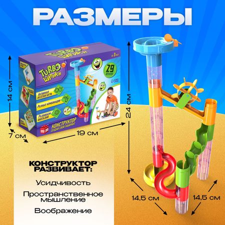 Конструктор «Turbo шарики», 29 деталей. «Турбо-шарики» — увлекательная игра, с которой ребенок сконструирует разнообразные лабиринты и устроит с друзьями чемпионат по запуску мячиков. Победит тот, чей снаряд первым придет к финишу. Набор состоит из прозрачных трубочек, разноцветных мостиков, извилистых дорожек и мельниц. Малыш без труда соорудит трассу любой длины и сложности и будет следить за перемещениями шариков. Все элементы выполнены из качественного пластика, легко соединяются между собой и образуют прочную конструкцию. В комплекте 29 деталей. Для детей старше 3 лет.