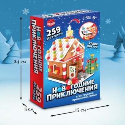 Конструктор «Новогодние приключения: Пряничный домик», шкатулка, 259 деталей. Маленькому любителю волшебства непременно понравится новогодний конструктор. С ним ребенок не только разыграет праздничный сюжет, но и сможет придумать свои истории. Малыш соберет настоящую праздничную шкатулку, в которой сможет хранить разные мелочи. Подарок не только хорошо впишется в любой интерьер, но также создаст новогоднее настроение друзьям и близким. <b> Особенности</b> <ul> <li> Количество элементов — 259.</li> <li> Все элементы изготовлены из высококачественной нетоксичной пластмассы, надежно соединяются между собой и разбираются без особого труда.</li> <li> Рекомендован для детей от 6 лет.</li> </ul> <b> Играем с пользой</b> Игры с конструктором разовьют у ребенка мелкую моторику, внимательность, воображение, логическое и образное мышление.