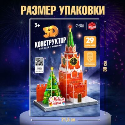 Конструктор 3D «Спасская Башня», 29 деталей, с гирляндой, новогодний. С 3D-конструктором вы соберете одну из значимых достопримечательностей столицы. Спасская башня — представляет собой знаковую часть архитектурного ансамбля центра столицы. По известности с ней не сравнится ни одна другая московская башня, ведь только здесь можно увидеть те самые Куранты, над которыми горит пятиконечная рубиновая звезда. По традиции мимо Спасской башни проходит ежегодный парад 9 мая. <b> Особенности конструктора</b> <ul> <li> Для сборки не потребуется клей или ножницы. Достаточно выдавить картонные элементы с листа-основы и, руководствуясь числовыми обозначениями на деталях, последовательно соединить их друг с другом.</li> <li> Размер собранной модели: 24,5 × 34,5 × 14,3 см.</li> </ul> <b> Увлекательно и полезно</b> Конструируя, ребенок развивает мелкую моторику рук, познавательную активность и воображение, становиться усидчивее и внимательнее. Для детей старше 3 лет.