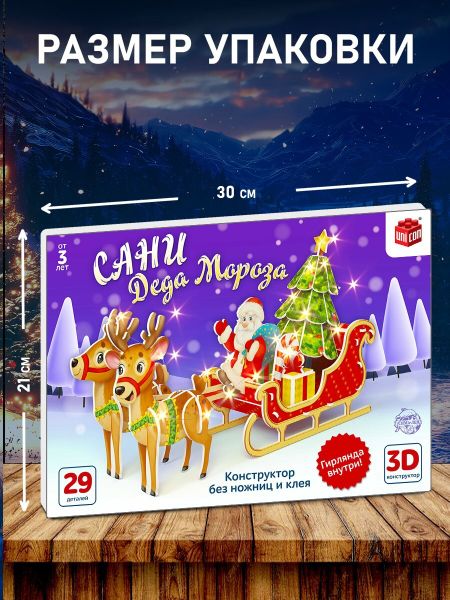 Конструктор 3D «Сани Деда Мороза», со светодиодной гирляндой, 29 деталей. Конструктор 3D «Сани Деда Мороза» — увлекательный набор для создания праздничного украшения. Сборка превращается в увлекательный процесс, а готовая модель станет частью новогоднего интерьера. Светодиодная гирлянда добавит волшебного сияния, создавая атмосферу зимнего праздника. <b> Что внутри</b> <ul> <li> 29 деталей для сборки прочной и красивой конструкции.</li> <li> Светодиодная гирлянда для эффектного свечения.</li> <li> Простая и понятная инструкция.</li> </ul> <b> Преимущества</b> <ul> <li> Отлично подходит для новогоднего декора дома, офиса или детской комнаты.</li> <li> Развивает внимание, усидчивость и творческое мышление.</li> <li> Сборка доступна даже новичкам — процесс понятен и не требует клея.</li> <li> Готовая модель станет оригинальным подарком или украшением.</li> </ul> <b> Создаем праздничное настроение</b> Сборка конструктора подарит радость творчества и погружение в новогоднюю атмосферу. Это не просто игрушка, а стильный элемент декора, который будет радовать всю зиму. А светодиодная гирлянда сделает композицию еще ярче!