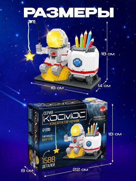 Конструктор «Космос», ночник и подставка под карандаши, 1 588 деталей. Из 1 588 деталей ребенок сможет собрать яркий, космический арт-объект, который украсит настоящая гирлянда, создавая мягкое, приятное освещение. Конструктор имеет высокий уровень сложности, подходит для детей от 6 лет и станет отличным подарком для всех, кто любит собирать сложные конструкции и интересуется космосом. Сборка этого набора развивает мелкую моторику, внимание, пространственное воображение и навыки следования инструкциям. Подробное руководство поможет ребенку справиться с каждой деталью и получить качественный результат, которым он будет любоваться каждый вечер. <b> Характеристики</b> <ul> <li> Количество деталей: 1 588 элементов для сборки сложной конструкции.</li> <li> В комплект входит гирлянда, которая добавляет модели эффект свечения.</li> <li> Уровень сложности: высокий. Конструкция подходит для детей от 6 лет.</li> <li> Время сборки: около 3 часов, увлекательное занятие для спокойного вечера.</li> <li> Игрушка изготовлена из прочного и безопасного пластика, безопасного для детей.</li> <li> Внутри есть подробная инструкция с пошаговым описанием сборки.</li> <li> Для работы понадобятся 2 батарейки типа IR44</li> </ul> <b> Польза от сборки</b> <ul> <li> Развивает моторику и координацию — взаимодействие с мелкими деталями требует аккуратности и повышает ловкость рук.</li> <li> Стимулирует пространственное воображение — благодаря сборке ребенок учится понимать, как отдельные элементы создают сложные формы.</li> <li> Воспитывает терпение и концентрацию — сборка потребует внимательности и усидчивости.</li> </ul>