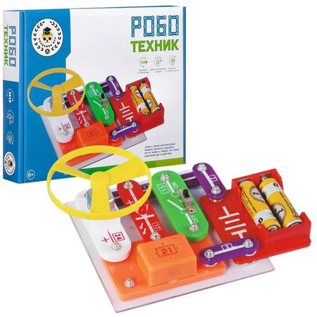 Развивающий конструктор из серии «Роботехник» от Академии игр состоит из элементов, для удобства пронумерованных и окрашенных разными цветами.В наборе красочное руководство, в котором подробно описаны и изображены поэтапные шаги сборки электрических цепей и необходимые детали.Данный набор, на практике, знакомит детей с основами физики и устройством электронных приборов.Вы узнаете, как работают последовательные и параллельные схемы соединения элементов электрической цепи, как устроены и работают лампы накаливания, светодиод, реле и выключатель, электромотор постоянного тока.Почему при смене полярности мотор начинает работать в противоположном направлении, а светодиод перестает светить. Это и много другое вы узнаете в процессе игры с конструктором «Роботехник».Руководство содержит 58 варианта сборки схем с пояснениями.Для работы необходимо 2 батарейки 1,5V тип АА (не входят в комплект).
