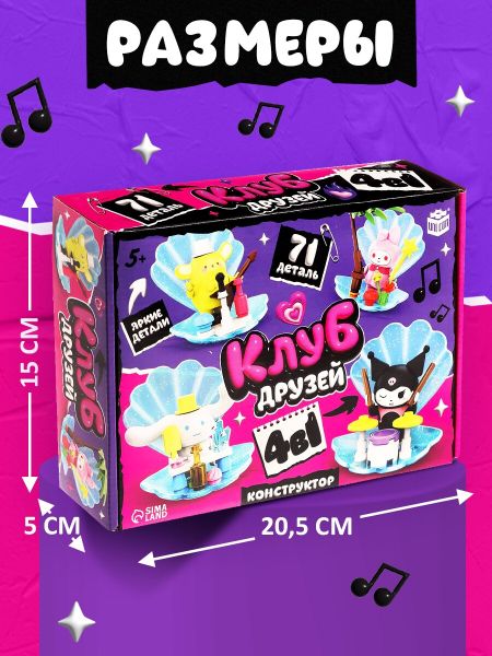 Конструктор блочный «Клуб Друзей», 4 в 1, 71 деталь. Создай свой мир дружбы и приключений! <strong> Конструктор блочный «Клуб Друзей»</strong> – это увлекательный игровой набор, в котором ребенок сможет собрать четыре различные модели, создавая свой уникальный уголок для веселых историй. <strong> Особенности</strong> <ul> <li> <strong> 4 варианта сборки:</strong> Из деталей конструктора можно создать разные игровые зоны, расширяя возможности для сюжетных игр.</li> <li> <strong> Развитие фантазии:</strong> Конструирование и комбинирование элементов помогают ребенку придумывать новые сценарии и экспериментировать с дизайном.</li> <li> <strong> Прочные соединения:</strong> Детали надежно крепятся друг к другу, конструкции устойчивы и подходят для активной игры.</li> <li> <strong> Яркий дизайн:</strong> Красочные элементы делают готовые модели привлекательными, а игровые сюжеты – еще интереснее.</li> <li> <strong> Совместимость с другими наборами:</strong> Можно комбинировать с аналогичными конструкторами, создавая целый город для друзей.</li> </ul> <strong> Играй, строй, фантазируй!</strong> Этот конструктор вдохновит ребенка на создание увлекательных историй и подарит часы захватывающего творчества!