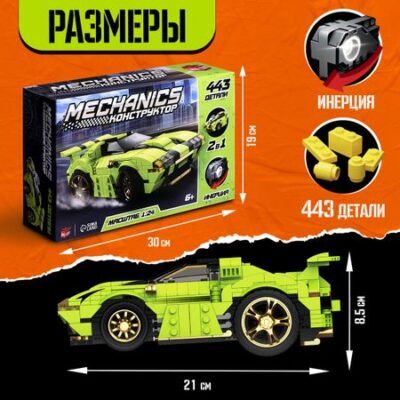 Конструктор гоночная машина «Техника. Mechanics», инерционный, 1:24, 2 варианта сборки, 443 детали. Конструктор «Техника» домчит малыша до цели несмотря на все преграды! Это настоящий зверь среди автомобилей, который только внешним видом способен повергнуть в ужас любого соперника! Ручная трансформация добавляет мощному авто солидности и делает его непобедимым. Стильный дизайн и проработанные элементы привлекут внимание ребенка, а подвижные детали сделают игру динамичнее и интереснее. <b> Особенности</b> <ul> <li> Машинка трансформируется в другую модель.</li> <li> Количество деталей — 443 штуки.</li> <li> Размер машинки в собранном виде: 29,7 × 18,9 × 8 см.</li> <li> Все элементы выполнены из качественного нетоксичного пластика.</li> <li> Конструктор предназначен для детей от 6 лет.</li> </ul> <b> Играем с пользой</b> Конструктор «Техника» — это не просто игрушка, а детализированная модель реального автомобиля, которая поможет ребенку: <ul> <li> познакомиться с новым видом транспорта,</li> <li> развить мелкую моторику рук,</li> <li> развить воображение и придумывать новые сюжеты для игр,</li> <li> потренировать пространственное мышление.</li> </ul>