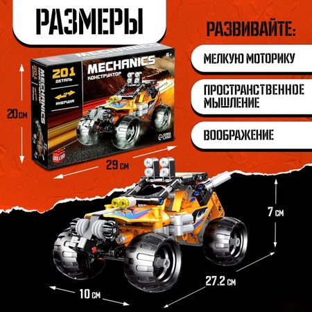 Конструктор гоночная машина «Багги» UNICON Техно, инерционный, 201 деталь, 6+. Конструктор «Багги» — сборная модель гоночного автомобиля, которую ребенок соберет своими руками. С ней юный гонщик окажется в мире захватывающих заездов на скорость, где он будет стремиться стать первым на финише и завоевать титул чемпиона! <b> Особенности конструктора</b> <ul> <li> Набор состоит из 201 детали.</li> <li> Подробная инструкция поможет в сборке модели машинки.</li> <li> Встроен инерционный механизм. Он позволяет задать собранной модели скорость и дает возможность двигаться самостоятельно, по инерции.</li> <li> Все элементы надежно соединяются между собой и разбираются без особого труда.</li> <li> Детали конструктора изготовлены из высококачественной пластмассы.</li> <li> Подходит для детей старше 6 лет.</li> </ul> <b> Увлекательно и полезно!</b> Сборка конструктора способствует развитию у ребенка мелкой моторики, логического мышления и пространственного воображения.