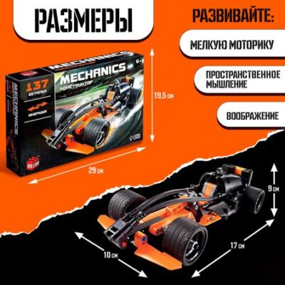 Конструктор гоночная машина UNICON Техно, инерционный, 137 деталей, 6+. Конструктор Mechanics — модель гоночного автомобиля, которую ребенок соберет своими руками. С ней юный гонщик окажется в мире захватывающих заездов на скорость, где он будет стремиться стать первым на финише и завоевать титул чемпиона! <b> Особенности конструктора</b> <ul> <li> Набор состоит из 137 деталей.</li> <li> Подробная инструкция поможет в сборке модели машинки.</li> <li> Встроен инерционный механизм. Он позволяет задать собранной модели скорость и дает возможность двигаться самостоятельно, по инерции.</li> <li> Все элементы надежно соединяются между собой и разбираются без особого труда.</li> <li> Из двух моделей серии Mechanics можно собрать уникальную модель. Смотрите подробности на обратной стороне коробки.</li> <li> Детали конструктора изготовлены из высококачественной пластмассы.</li> <li> Подходит для детей старше 6 лет.</li> </ul> <b> Увлекательно и полезно!</b> Сборка конструктора способствует развитию у ребенка мелкой моторики, логического мышления и пространственного воображения.