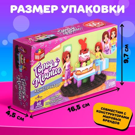 Конструктор Город Мечты «Праздничный торт», 60 деталей. <b> Мечта каждой девочки!</b> Конструктор UNICON Город мечты, это место где мечтает побывать каждая девочка. Соберите все игровые сюжеты розвого мира! <b> Особенности:</b> <ul> <li> Элементы изготовлены из высококачественной пластмассы, надежно соединяются между собой и разбираются без особого труда.</li> </ul> <b> Не только увлекательно, но и полезно!</b> Следуйте подробной инструкции, и ребенок с легкостью соберет сюжет. Конструируя, ребенок развивает мелкую моторику рук, познавательную активность и воображение, становиться усидчивее и внимательнее. Товар предназначен для детей старше 6 лет.