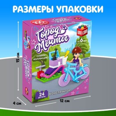 Конструктор Город Мечты «Велосипедный сервис», 24 детали. <b> Мечта каждой девочки!</b> Конструктор UNICON Город мечты, это место где мечтает побывать каждая девочка. Соберите все игровые сюжеты розвого мира! <b> Особенности:</b> <ul> <li> Элементы изготовлены из высококачественной пластмассы, надежно соединяются между собой и разбираются без особого труда.</li> </ul> <b> Не только увлекательно, но и полезно!</b> Следуйте подробной инструкции, и ребенок с легкостью соберет сюжет. Конструируя, ребенок развивает мелкую моторику рук, познавательную активность и воображение, становиться усидчивее и внимательнее. Товар предназначен для детей старше 6 лет.