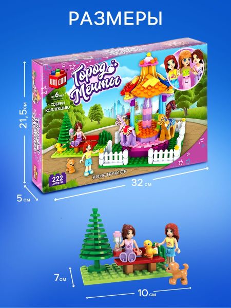 Конструктор Город Мечты «Забавная карусель», 222 детали. <b> Мечта каждой девочки!</b> Конструктор UNICON Город мечты, это место где мечтает побывать каждая девочка. Соберите все игровые сюжеты розвого мира! <b> Особенности:</b> <ul> <li> Элементы изготовлены из высококачественной пластмассы, надежно соединяются между собой и разбираются без особого труда.</li> </ul> <b> Не только увлекательно, но и полезно!</b> Следуйте подробной инструкции, и ребенок с легкостью соберет сюжет. Конструируя, ребенок развивает мелкую моторику рук, познавательную активность и воображение, становиться усидчивее и внимательнее. Товар предназначен для детей старше 6 лет.