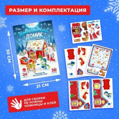 Конструктор из пенокартона 3D «Новогодний домик», 24 детали. Создай волшебство своими руками! 3D-конструктор «Новогодний домик» из пенокартона — это уютный праздничный набор для создания зимнего чуда. 24 детали превращаются в объемный домик без ножниц и клея — просто соединяй элементы и украшай праздник. <ul> <li> Легкая сборка: детали из мягкого EVA-материала и бумаги легко соединяются между собой. Четкая инструкция поможет собрать домик за 15-20 минут.</li> <li> Безопасные материалы: пенокартон приятный на ощупь, не пачкает руки и подходит детям от 3 лет. Все детали с закругленными краями.</li> <li> Новогоднее настроение: готовый домик станет украшением праздника. Можно поставить под елку или использовать для зимних игр.</li> <li> Развивающая игра: сборка развивает пространственное мышление и мелкую моторику. Отличный способ подготовиться к празднику всей семьей.</li> </ul> Праздник в каждой детали: этот конструктор — не просто поделка, а настоящий новогодний ритуал. Собранный домик можно раскрасить или дополнить гирляндой — пусть праздник начинается с творчества! Идеальный подарок для детей, которые верят в чудеса.
