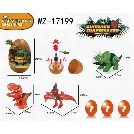 Этот необычный пластиковый динозаврик-конструктор спрятан внутри большого яйца. Внутри яйца спрятаны динозаврика 3-х видов: тираннозавр, трицератопс, птеродактиль.