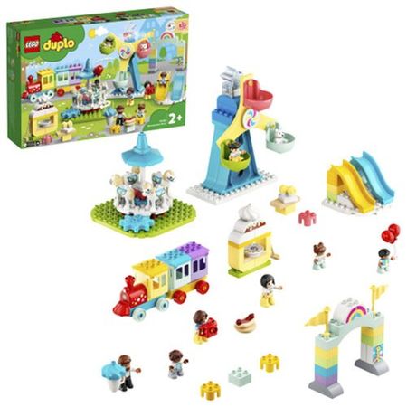В городском парке развлечений LEGO® DUPLO® вас ждет удивительная подборка аттракционов, управляемых вручную функций и семейных развлечений: от маленьких горок до невероятного колеса обозрения, от поездок на поезде до красочной карусели, и от хот-догов до меняющего цвет «радужного» фонаря. В этом наборе есть множество забавных развлечений, способных увлечь и дошкольников, и их родителей.»Парк развлечений» LEGO® DUPLO® (10956) – это удивительные аттракционы, практические функции и семейные развлечения, призванные увлечь, развлекать и стимулировать растущий разум.Содержит семь персонажей DUPLO – двух женщин, мужчину и четырех детей. В наборе есть две горки, механическая карусель, вращающееся колесо обозрения с тремя разноцветными кабинками, поезд и множество веселых дополнений.Такие аксессуары, как хот-доги, мороженое, фотоаппарат, шарики, кексы, метла и плюшевый медвежонок способствуют бесконечным ролевым играм. Здесь даже есть меняющий цвет «радужный» фонарь (в комплект входят 3 батарейки LR44).Этот большой, красочный и детализированный набор наполнен игровыми возможностями и развивающим весельем, чтобы вдохновлять на творческую игру, развивать мелкую моторику и поражать воображение дошкольников.Этот веселый игровой набор со множеством функций помогает обучать в игре детей в возрасте от 2 лет и дает возможность родителям разделить со своим малышом драгоценные моменты развития.Размеры набора составляют более 28 см в высоту, 123 см в ширину и 28 см в глубину. Его можно расположить различными способами, и он легко сочетается с другими игрушками LEGO® DUPLO®.Инструкции по сборке содержат веселую историю в картинках с элементами из набора, чтобы впечатления от творческой сборки и оригинальной игры были еще лучше.Все наборы LEGO® DUPLO® отлично проработаны, и вас ждут творческие возможности для свободной развивающей игры, которую родители могут разделить с малышами.Наборы LEGO® DUPLO®, произведённые с 1969 года, отвечают самым строгим отраслевым стандартам, поэтому их удобно брать, складывать и разъединять маленькими детскими пальчиками.Все кубики и детали LEGO® DUPLO® испытываются на падение, нагрев, удар и скручивание, чтобы убедиться в их соответствии самым высоким стандартам безопасности для детей.