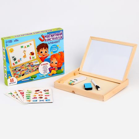Конструктор магнитный «Алфавит», 88 деталей. Конструктор магнитный в деревянной коробке — это увлекательная и функциональная игрушка для малышей. В зависимости от возраста ребенка конструктор поможет придумать разнообразные развивающие и обучающие игры и задания. <strong> Чем полезен конструктор? </strong> Двусторонняя доска поможет развить творческие способности, моторику, воображение и цветовое восприятие у детей любого возраста. Магнитный конструктор, состоящий из множества элементов, заинтересует Вашего малыша, юный ученик с удовольствием станет рассматривать, изучать и подбирать место для каждого магнитика. Одна сторона доски магнитная, на ней малыш может играть с картинками. Другая сторона — грифельная, на ней так здорово рисовать мелками! А главное, мама может быть спокойна: стены и двери теперь не пострадают! <strong> Особенности </strong> Деревянные детали игрушки качественно обработаны, не имеют сколов и зазубрин. Коробку с конструктором удобно брать в дорогу, чтобы ребенок не скучал во время длинного путешествия. В комплект входят: <ul> <li> доска,</li> <li> магниты,</li> <li> мелки,</li> <li> маркер,</li> <li> губка,</li> <li> буклет.</li> </ul> Крохе понравится играть и учиться с магнитным конструктором!