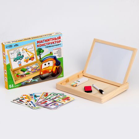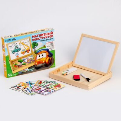 Конструктор магнитный «Транспорт», 51 деталь. Конструктор магнитный в деревянной коробке — это увлекательная и функциональная игрушка для малышей. В зависимости от возраста ребенка конструктор поможет придумать разнообразные развивающие и обучающие игры и задания. <strong> Чем полезен конструктор? </strong> Двусторонняя доска поможет развить творческие способности, моторику, воображение и цветовое восприятие у детей любого возраста. Магнитный конструктор, состоящий из множества элементов, заинтересует Вашего малыша, юный ученик с удовольствием станет рассматривать, изучать и подбирать место для каждого магнитика. Одна сторона доски магнитная, на ней малыш может играть с картинками. Другая сторона — грифельная, на ней так здорово рисовать мелками! А главное, мама может быть спокойна: стены и двери теперь не пострадают! <strong> Особенности </strong> Деревянные детали игрушки качественно обработаны, не имеют сколов и зазубрин. Коробку с конструктором удобно брать в дорогу, чтобы ребенок не скучал во время длинного путешествия. В комплект входят: <ul> <li> доска,</li> <li> магниты,</li> <li> мелки,</li> <li> маркер,</li> <li> губка,</li> <li> буклет.</li> </ul> Крохе понравится играть и учиться с магнитным конструктором!