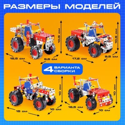 Конструктор металлический «Трактор», 4 варианта сборки, 160 деталей. С набором серии «Металекс» торговой марки Unicon ребенок соберет один из четырех видов самоходных машин. Используя отвертку и гаечный ключ, малыш построит трактор. Сначала юному инженеру необходимо соединить металлические пластины, как показано в инструкции, а затем закрепить детали через отверстия болтами и гайками. В процессе игры мальчишка научится обращаться с инструментами, получит конструкторские навыки и придумает собственные инновационные модели техники. Для этого нужно лишь проявить воображение и не бояться экспериментировать. В наборе 160 деталей.