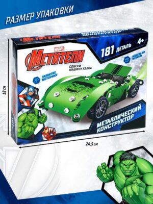 Конструктор металлический, Мстители Халк, 181 деталь. Собери мощный автомобиль супергероя! <strong> Металлический конструктор «Мстители. Халк»</strong> – это увлекательный набор для юных инженеров, позволяющий создать эффектную зеленую машину с изображением Халка. Конструкция собирается из металлических деталей, скрепляемых винтами, что делает готовую модель прочной и устойчивой. <ul> <li> <strong> 181 деталь для сборки автомобиля:</strong> В комплекте металлические и пластиковые элементы, а также инструменты для соединения деталей.</li> <li> <strong> Детализированный дизайн:</strong> Капот украшен изображением Халка, а корпус выполнен в фирменном зеленом цвете. Готовая модель станет украшением коллекции.</li> <li> <strong> Развитие навыков:</strong> Конструктор способствует развитию логического мышления, координации движений и усидчивости.</li> <li> <strong> Прочные материалы:</strong> Металлические элементы обеспечивают надежность конструкции, а пластиковые детали делают модель легкой и маневренной.</li> <li> <strong> Инструкция в комплекте:</strong> Пошаговое руководство помогает ребенку без труда собрать машину, обучаясь основам конструирования.</li> </ul> <strong> Отличный подарок для фанатов Marvel:</strong> Машина Халка понравится детям, которые увлекаются супергероями и любят технику. Конструктор объединяет игровую и обучающую составляющие, делая процесс сборки увлекательным и полезным.
