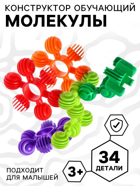 Конструктор обучающий «Молекулы», 34 детали. Конструкторы — это одни из любимых игрушек у детей разного возраста и пола, вне зависимости от наличия творческих способностей. Конструкторы развивают: <ul> <li> Пространственное мышление — ребенок познает соотношения элементов: право, лево, выше, ниже.</li> <li> Конструктивные способности — осознание, каким образом создаются различные объекты.</li> <li> Образное мышление — стиль мышления, который отвечает за создание определенного образа, который формируется в представлении ребенка.</li> <li> Мелкую моторику, глазомер — работая с конструктором, малыш развивает мелкие мышцы руки, учится соизмерять мышечное усилие, тренирует глаза.</li> <li> Творческие способности и воображение.</li> </ul>