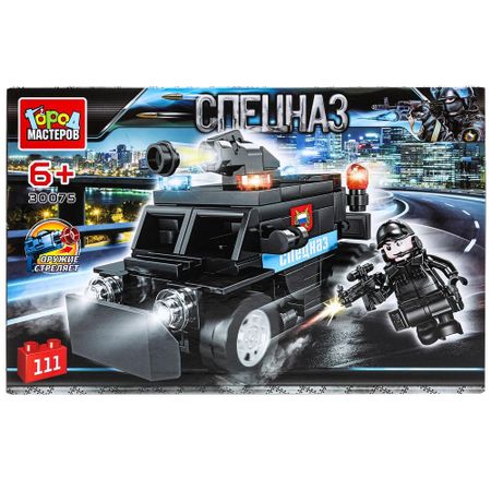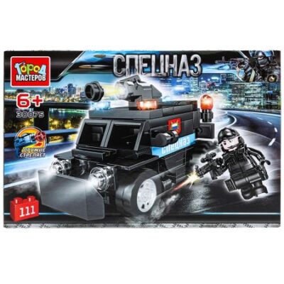 Конструктор ПОЛИЦИЯ Город мастеров 30075-KK. Конструктор «Джип спецназа» из серии «Спецназ» ТМ «Город мастеров» непременно понравится маленьким героям.<br> <br> Особенности и комплектация:<br> — 111 деталей<br> — 1 мини-фигурка<br> — оружие стреляет<br> — совместим с моделями конструкторов мировых брендов<br> — все детали легко и плотно соединяются между собой<br> <br> С помощью этого занимательного конструктора ваш ребенок может собрать реалистичную модель машины спецназа и фигурку бойца этого подразделения. Набор вдохновит детей на новые увлекательные сюжеты для игр и станет гордостью их игрушечной коллекции.<br> <br> Собирая конструктор ТМ «Город мастеров», ребенок будет развивать:<br> — мелкую моторику<br> — мышление<br> — внимание<br> — усидчивость<br> — логику<br> <br> Размер упаковки: 25 x 16 x 5 см. Материал: пластмасса.<br> Рекомендовано детям от 6-ти лет.